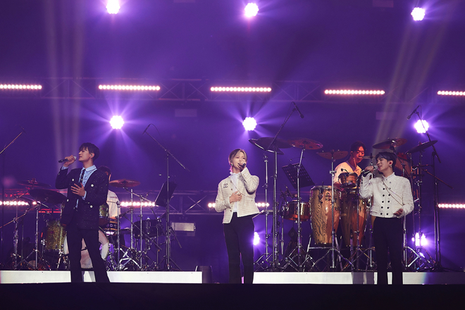 バンドパフォーマンスの間に再び衣装を着替え、エレガントな装いで、ここからは生バンドの演奏とともに歌を届けていく。デビュー曲の「Replay」、1stアルバム収録の「Love like Oxygen」はバンドアレンジによって印象を変え、15年の月日を経たからこそ醸し出せる落ち着いた雰囲気も漂う。他にもファンの歌声とともに一つの歌として完成した「Aside」や、美しいハーモニーを堪能できた「Kind」なども歌唱。さらに、生バンドが控えているということで、MCの途中に即興で「LUCIFER」を歌うというサプライズもあり、生演奏との相性の良さも証明する。そして、このブロックの最後であり、本編の最後ともなった「An Encore」で温かな歌声を届けると、紙吹雪が舞う中、メンバーたちはステージを後にした。