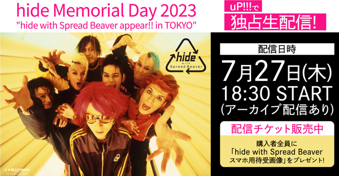 hide with Spread Beaverが7月27日に東京・豊洲PITで開催するワンマンライブ<hide 30th solo-debut anniversary hide Memorial Day 2023 “hide with Spread Beaver appear!! in TOKYO”>が、「uP!!!」で独占生配信される。