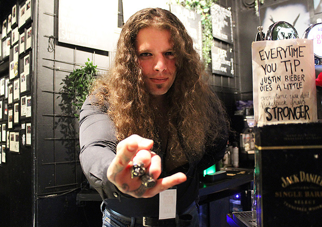 ユッシ69:いっぱいありすぎるよ(笑)。2015年のことだけど、当時まだよく知らなかったFive Finger Death Punchのクリス・ケールがやってきて、ここのバーに彼のベースを置かないといけない。あそこの壁にと場所を指定されたので、ここにペンがあるから指定した壁に予約しておいたらどうだと言ったら壁にベースの絵を描いて、彼のベースを飾る場所が決まっていたんだけど、それから1年以上たってたと思うけど、クリスがベース持ってやってきてひざまずいて、サー、これを!ってベースを差し出したんだ。それが今壁に飾られてる。そういう素晴らしい思い出がある。