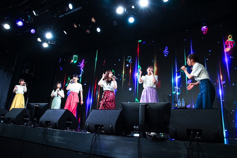 ステージは再びライブパートとなり、YouTubeでも公開している「夢見る 15歳」と「世界は恋に落ちている」のアカペラカバーを2曲連続で披露。ステージ奥の大画面LEDには楽曲に合わせたネオンや夕方の校舎などの映像が投影され、重なった6名の歌声をさらにエモーショナルに演出していった。