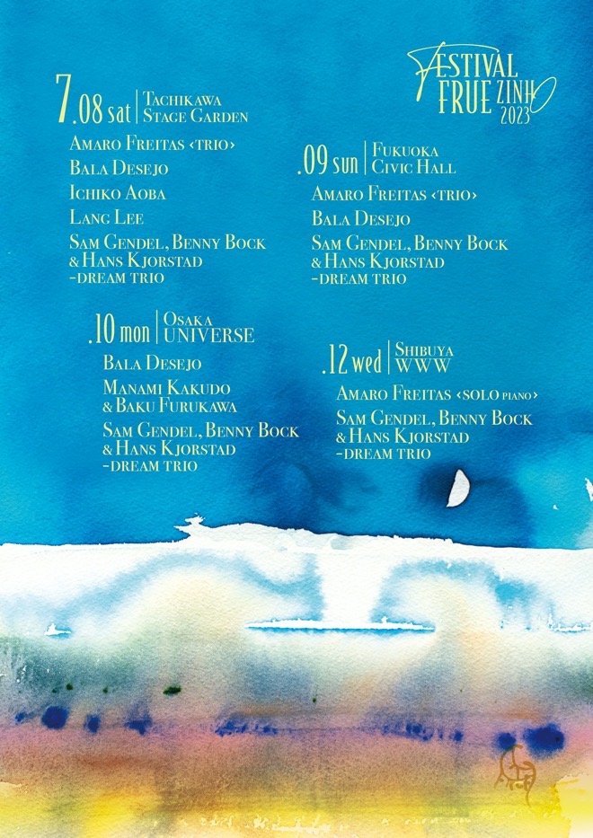 毎年11月に掛川にて開催されている<FESTIVAL de FRUE>とはまた違った都市型のコンパクトな音楽フェスティバルとして、昨年から始まった<FESTIVAL FRUEZINHO>。ブルーノ・ペルナーダス、cero (東京のみ)、サム・ゲンデル&サム・ウィルクス、Shintaro Sakamoto (東京のみ)、折坂悠太 (大阪のみ)を迎え開催した昨年に続き、今年は、<FRUE>ではもはやおなじみのサム・ゲンデルはベニー・ボック、ハンス・キョルスタッドとの“ドリーム・トリオ”として、またブラジルより要注目な初来日の2組、アマーロ・フレイタスとバーラ・デゼージョ、そして日本からは<FRUE>初出演となる青葉市子を迎え、3都市4公演での開催となる。
