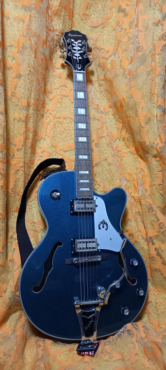 世の中青色のギターなんて、星の数ほどあるわけですが、その中でもピンポイントにエンペラー・スイングスターに目をつけるなんて、できる男すぎる。年齢は思春期とのことですけど、目利きの鋭さは解脱した楽器人の貫禄や。そもそもデルタブルーメタリックというネーミングがカッコいいよね。緑のフォレストグリーンメタリックもカッコいいけど。ジャズでもロックでもポップスでもブルースでも、しっとりでも大暴れでもどんな音楽だっていけちゃうよという不思議な包容力のあるギターなので、これ1本あったらマジOKというファイナルウェポンになるギターです。(JMN統括編集長 烏丸)