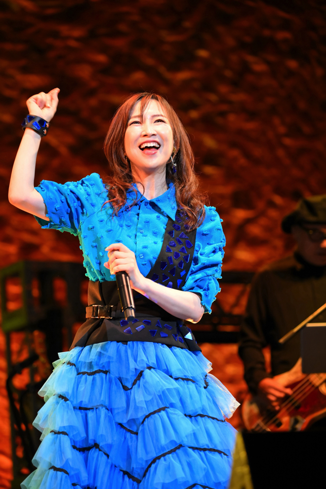 拍手が鳴り止まない中で迎えたアンコールでは、森口は黄色のドレスにコンサートTシャツ、下ろしていた髪をアップにまとめた姿で再登場。披露したのはタイトル通りお祭り感満載のダンスナンバーの「ハッピー2・ダンス / with DJ赤坂泰彦」。軽妙な歌詞を楽しげに歌う森口を、客席は入場時に配られたうちわを振って盛り上げ、一足早い夏を一体となって楽しんでいた。終盤に来てさらにアクセルを踏み込み「スピード」へ。小気味良いポップチューンにコール&レスポンスや合いの手がはまり、ライブのクライマックス間近でも元気印満点の森口の歌声が圧巻だ。