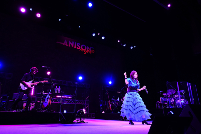 大人なジャズアレンジが効いたサウンドに森口の伸びやかな高音がマッチし、聴かせるような歌声で多幸感に包み込んでいく。1曲目が終了し、MCの第一声では、「声が聞けた〜!」と声出し解禁に対する喜びを爆発させた。さらに「覚悟はいいですか。アニソンの魅力をたっぷり浴びて帰ってほしい」と呼びかけ、集まったファンのボルテージを上げる。
