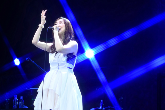 森口の音声解説とともにバンドメンバーによるアニソンメドレーが披露。会場が更に盛り上がりを見せたところで、シアーが効いた白の衣装にチェンジした森口が登場。コンサート中盤は、「ETERNAL WIND 〜ほほえみは光る風の中〜」からスタート。すこやかで爽やかな歌声と次第に変容していくサウンドが神秘さを醸しだし、森口のボーカリストとしての表現力の豊かさを再認識させてくれる。MCをはさみ、ボサノバ調のアレンジが印象的な「City Hunter 〜愛よ消えないで〜」をしっとりとメロディアスなステージングを披露する。