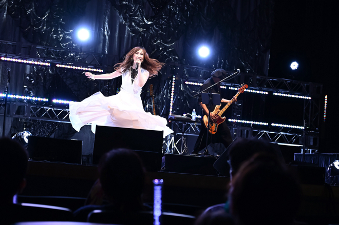 続くMCでは客席から「55歳おめでとう」の声が飛ぶと、森口も「声出し解禁でいきなり(笑)」と喜び、自身と同じ6月生まれの人に向けて共に「ハッピーバースデートゥーユー」を歌唱。歌声と合わせて客席とコミュニケーションを繰り広げるMCでも会場を沸かせる。そこから冒頭アカペラでこぶしを効かせて一気に曲の世界観に引き込み、静謐さを漂わせながら「LOVE SONG」をアクト。さらに本家TM NETWORKも参加した「BEYOND THE TIME 〜メビウスの宇宙を越えて〜 / with TM NETWORK」へ。切なさの中にも大地をしっかり踏みしめるような強さも感じさせる歌声を響かせ、会場からは大きな拍手が巻き起こっていた。