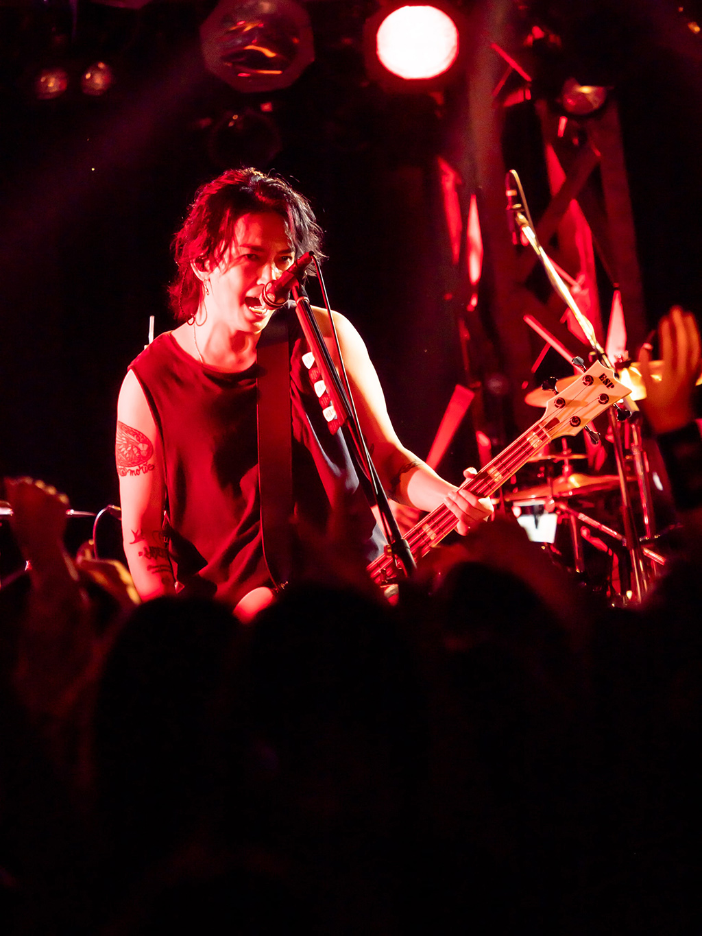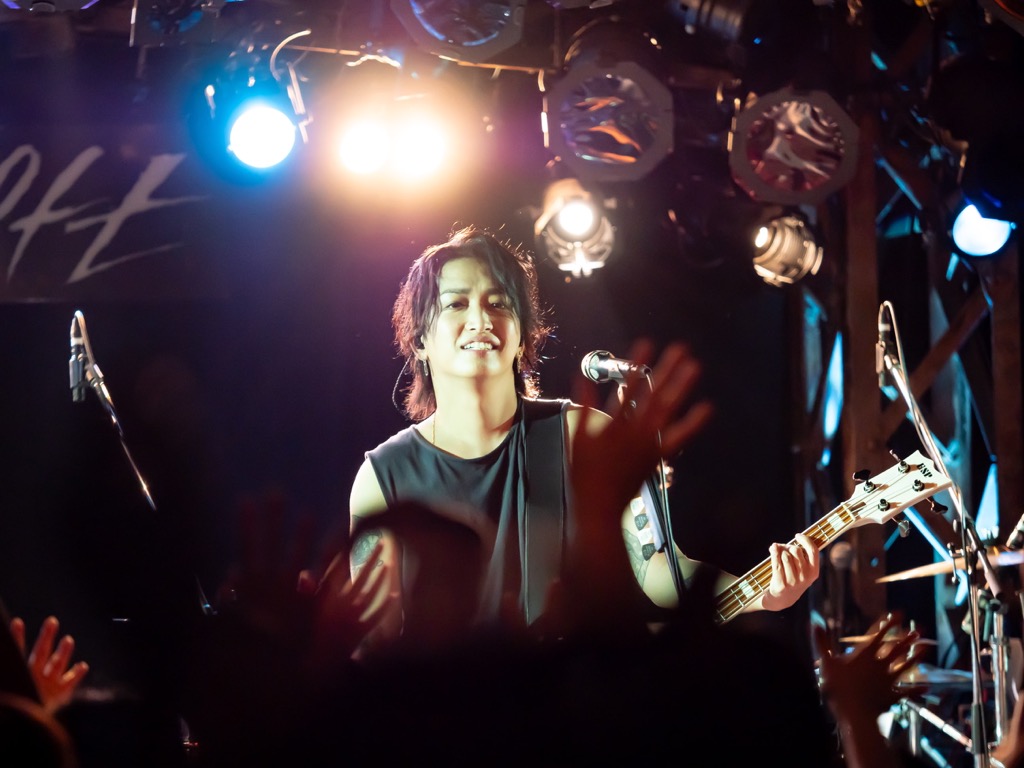 約3年間のコロナ禍も諦めず、配信や規制下でのライブを精力的に行ってきたAKi。「新宿LOFT! 分かってんだろ、ファイナルだぞ? ひとつになろうぜ!!」と、フロアを煽って始まった「Be Free」や「FAIRY DUST」もライブ定番曲だが、会場中がジャンプや掛け声を合わせて生まれるライブ感で、コロナ禍とは全く違った印象を受ける。「飛べ、飛べ!」とフロアを煽るAKiのベースサウンドや歌声も、観客との相乗効果でいつもより勇ましく力強く響き、AKiのアグレッシブなベースプレイがバンド演奏をグイグイ引っ張っていた「Monolith」は、いつも以上にヘヴィで息の合ったバンドアンサンブルを生み出していた。