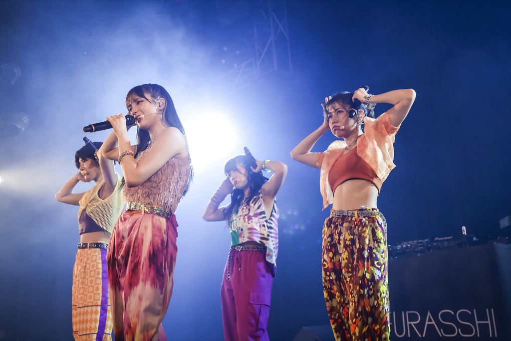 ライブが開演すると、ゲストのRAM RIDERがさっそくステージ上のDJセットに登場。RAM RIDERによる煽りやミラーボールの光によって会場の温度がふつふつと沸き立っていく中、この日のために用意されたポップかつスタイリッシュな新衣装を着用したAMEFURASSHIも観客の前に姿を現した。4人が「Fly Out」でライブをスタートさせ、大量のスモークに包まれながら歌とダンスを届けると、その迫力にフロアは一気に大盛り上がり。