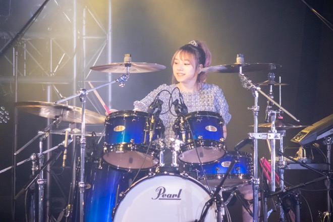 さらに続いた曲は、佐藤が2022年に結成したグループ=Musesからのナンバー「Blow Away!!」。Musesは女性4人のフュージョンバンドで、2022年10月に1作目『Muses』もリリースしている。「Blow Away!!」はそこに収録されている曲でもあるが、本日はイベントに合わせたスペシャルバージョンだ。かわいいのに、叩くフレーズは超絶にテクニカル。そのギャップもえぐい。中盤にはドラムソロもフィーチャーし、プログレッシヴなフレージングでも来場者たちを魅了。曲のエンディングを激しいフィル・フレーズと共に決めると、客席からは賞賛の歓声も湧き上がった。