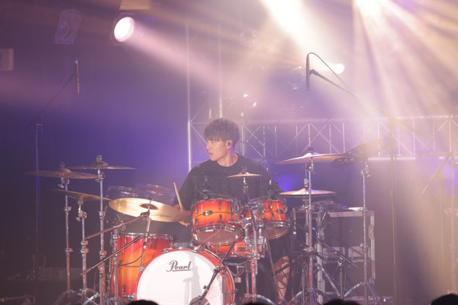 曲がエンディングに差し掛かったところで、Kid’zのドラムソロに展開。スティックの動きが見えないぐらいの速さで次々に叩くフレージングの音数といい、アタック感の気持ちよさといい、Kid’zの本領をこれでもかと見せつけていく。間近で展開する白熱のドラミングに来場者たちの興奮は高まり続けた。
