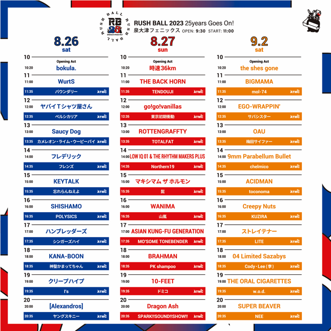 8月26日と27日、9月2日に大阪・泉大津フェニックスで開催される<RUSH BALL 2023>のタイムテーブルが発表された。