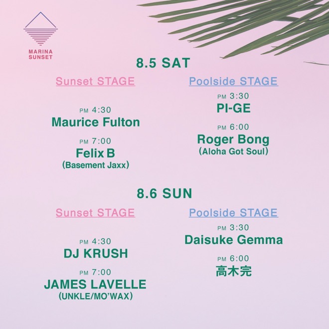 [Sunset Stage]、[Poolside Stage]の2つのステージで総勢8組の豪華アーティストがプレイ。初日には、フェリックスB(ベースメント・ジャックス)、モーリス・フルトン、ロジャー・ボン(Aloha God soul)、PI-GEが出演。2日目はジェームス・ラヴェル(UNKLE/MO’WAX) 、DJ KRUSH、高木 完、Daisuke Gemmaといった豪華ラインナップが登場する。