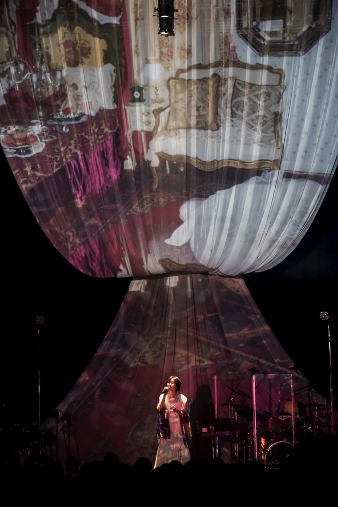 自身にとって久しぶりの有観客ライブ。その幕開けは特徴的なイントロから始まる新曲「プライベート・ルーム」(TVアニメ『もののがたり』第二章エンディングテーマ)だ。作詞・大木貢祐&作曲・神田ジョンの黄金タッグによるオシャレな一曲を、淡いベージュのドレスに身を包んだ田所が美しく歌い上げる。背後の大きな幕を使った映像もステージを彩り、自身の新たな世界観に観客を誘っていった。