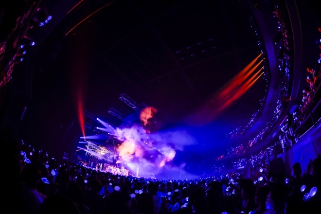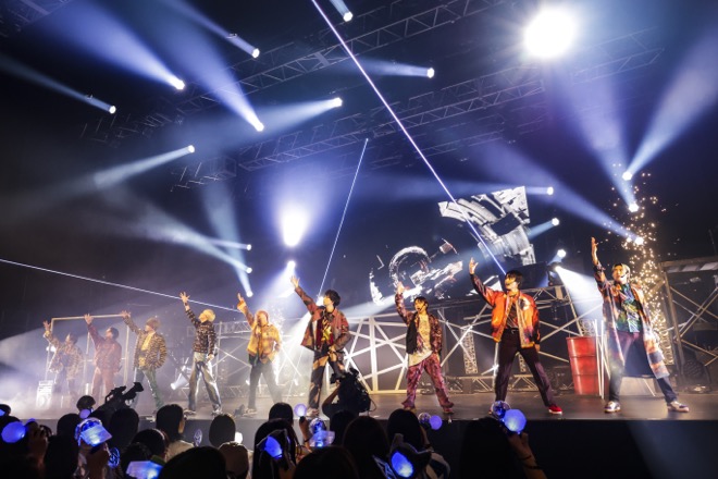 噴き出す火花の助けも借りながら、グループ内それぞれの役割を明確にアピールしたところで、色っぽい表情で魅了する「Monster!」に勢いよくBLUEを煽る「SWEET DEVIL」と、タイプの異なる人気シングル曲を連投。ステージ後方の大型モニターには、リアルタイムのパフォーマンスが映し出されるが、古川のプロデュースによるカラフルでゴージャスな衣装に身を包んだ9人はどの瞬間、誰を切り取ってもキマッており、グループカラーである青のライトスティックを振るBLUEの狂乱も納得だ。