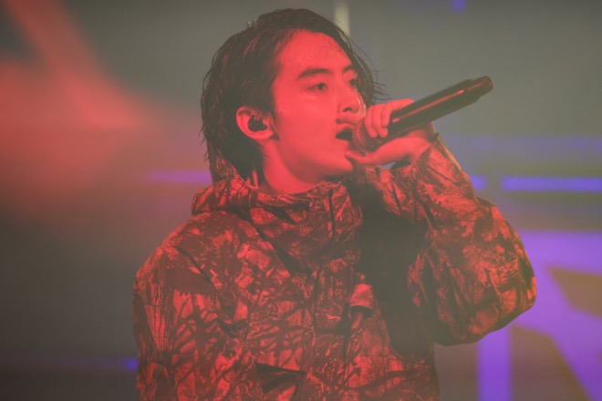 さらに、全身黒に着替えた田中が得意のヒューマンビートボックスを長尺で聞かせ、緻密かつ重低音な響きで足元から場内の空気を震わせると、ラッパーのジャンと松村を手始めに次々とメンバーを招き入れて「Don’t Turn It Down」へ。ステージの横幅いっぱいに展開し、肩の力を抜きながら己を誇示するラップ&ボーカルとダンサー陣で二列構成となるフォーメーションも巧みで、そんなSUPER★DRAGONならではの組み合わせの妙は「So Woo」でも同様だ。ファンクなビートに乗せて、プリミティブなボーカル、グルーヴィーなラップ、野性味あふれるダンスとそれぞれが光り、再びビートボックスを存分に轟かせた田中はジャンと満足げにハイタッチ。従来の持ち味の上に新たな可能性を開花させる―。そんな彼らの姿勢が、この日のライブではハッキリと見えた。