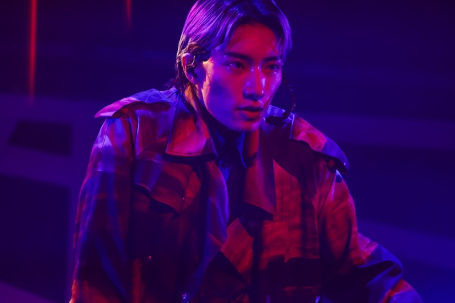 すかさず上手にジャン海渡、下手に松村和哉が現れて切れ味鋭いラップを繋げば、センターの扉が開いてダンサー4人が飛び出し、下手から池田彪馬、上手の壇上から田中洸希と、ボーカル陣が加わる鮮烈なオープニングで、BLUEの眼を釘付けにする。