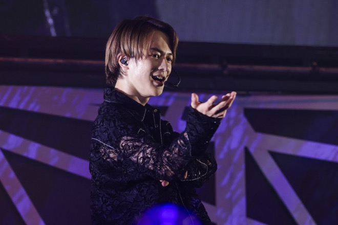 続いて、伊藤壮吾の車掌アナウンスから始まったのは、志村玲於、飯島颯、伊藤、柴崎楽のダンサー陣が初めて4人でハンドマイクを取った「SAWAGE!!!!」。“お茶の子さいさい”“参勤交代”といったワードが登場し、コミカルな色の強い和風お祭りトンチキソングは、志村いわく「爆笑しながら振り付けした」とのことで、お神輿代わりに飯島が担ぎ上げられる場面もあった。ちなみにジャンと松村が手掛けた歌詞には志村の紅茶、柴崎の料理など、メンバーにまつわる要素もしっかり盛り込まれており、ジャンの自宅で行った作曲の様子も「いつか(映像を)公開したい」(松村)とのこと。また、伊藤の“君の瞳に乾杯♪”、柴崎の“子猫ちゃん♪”というキメ台詞には黄色い悲鳴の嵐が吹き荒れたが、大阪公演では「レコーディングでの和哉の“子猫ちゃん♪”のこだわりが凄かった」という秘話も柴崎から明かされたので、リリースを楽しみにしたい。