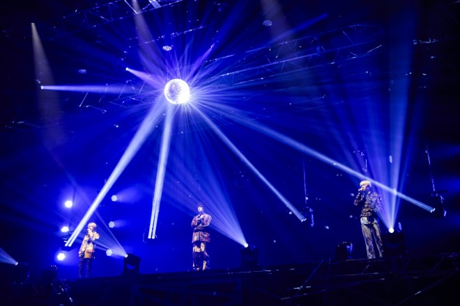 なめらかなボーカルとマシンガンラップをぶつけ合うガチバトルで、年齢に似合わぬ危険な色気を振りまき、息の合ったテクニカルで激しいダンスも圧巻。一瞬たりとも目が離せない濃厚なコラボレーションを果たし、MCで「最終日、一番カマせたんじゃないか」と池田が自信を見せたのも当然だろう。一転、壇上でアコースティックバラード「maybe it’s you」をしっとり歌い上げたのは古川毅、ジャン海渡、田中洸希の3人だ。アグレッシブなラッパーイメージの強いジャンとバラードの取り合わせは意外だが、それだけに貴重で、BLUEもステージに全集中。君への想いを綴るエモーショナルな歌声が輝くミラーボールに共鳴して、いっそう切なさを際立たせていく。