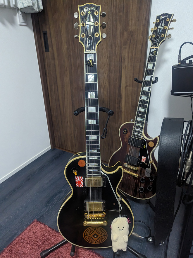 正面のはギブソンレスポール、ブラックビューティー57年復刻とレギュラー生産の自慢のギターです。実は数年前の災害に遭い、一週間ほど土砂にまみれてましたが何とか復活してくれた思い入れの強いギターです。後ろのレギュラー生産のカスタムも同様です。