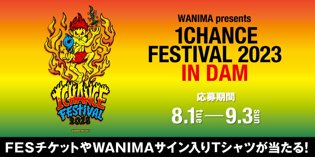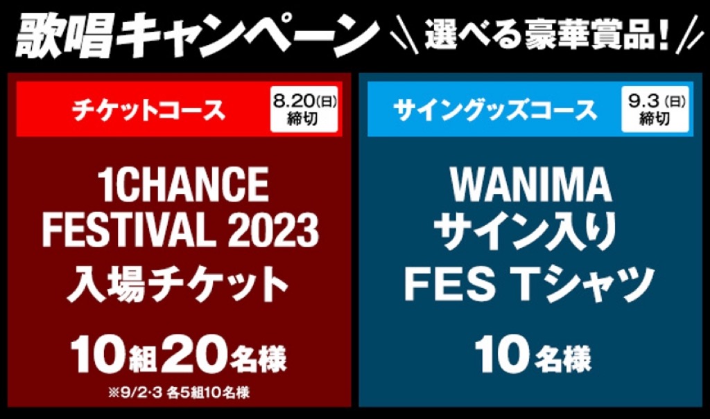 そんなイベントとのコラボキャンペーンである<WANIMA presents 1CHANCE FESTIVAL 2023 IN DAM>は8月1日(火)からスタート。出演アーティストの課題曲を歌唱することで<WANIMA presents 1CHANCE FESTIVAL 2023>のペアチケットやWANIMA直筆サイン入りのFES Tシャツがプレゼントされる。
