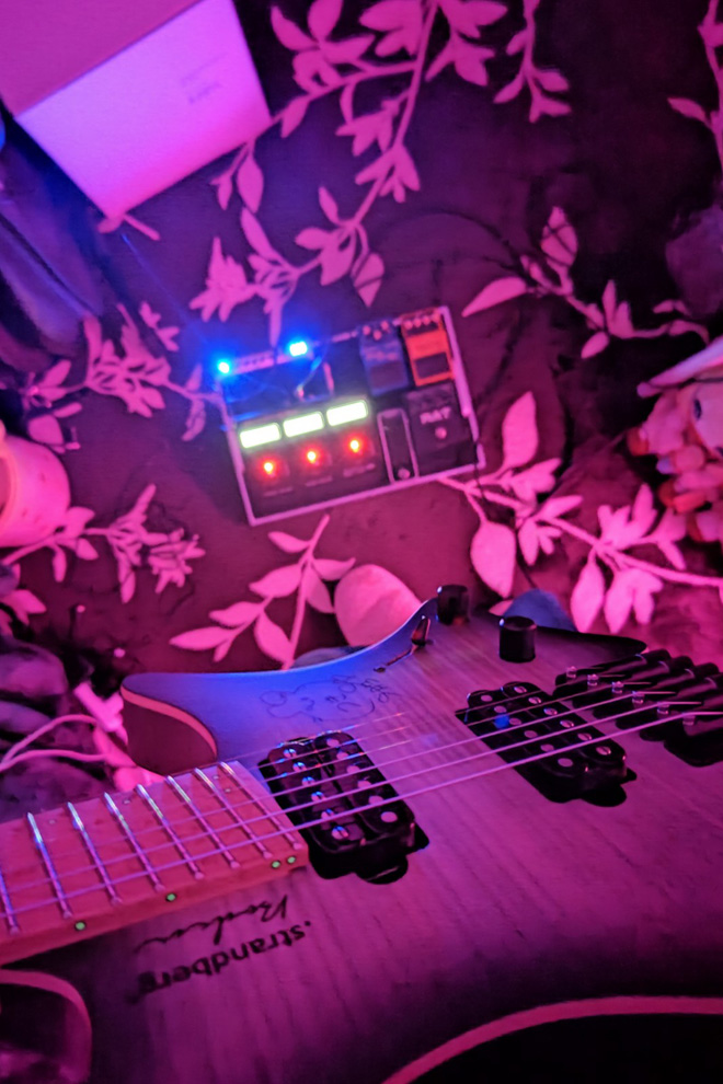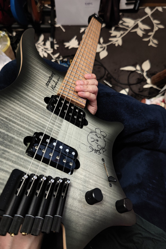 ストランドバーグに恋をしてしまう気持ちはよーく分かる。ギターを知れば知るほど、機能性と芸術性、演奏性とサウンド特性を高次にバランスさせていくとこうなるんじゃないかという、究極の設計に見えてきますよね。それが推しのサインとともに自分の愛機になるってのは、ギタリストとギターの理想のあり方。なんて幸せなお方。スマホリングがイケてますが、シールドを刺す前にここを通したら実用性も出てきますね。不用意なシールド抜けを推しの力で予防する。最高やん。(JMN統括編集長 烏丸)
