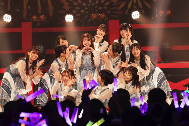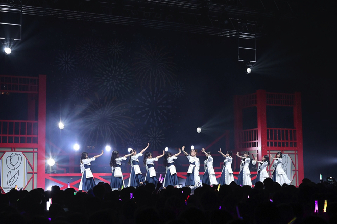 折しもその日、関東甲信越地方の梅雨明けが宣言される。長い一日は、昼公演の祭ばやしにアレンジされたOvertureで幕を開けた。いなせな法被をまとい、暗闇の中でペンライトを持ちさまざまな花火を表現するパフォーマンスで湧かせた「打ち上げ花火の拒否権」。後輩メンバーへのコールも定着し、ファンとの一体感が高まる「韋駄天娘」。11th収録のユニット曲も3組それぞれの個性を極める。