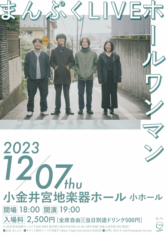 この公演は、まんぷく結成の地元・東京都小金井にある、・小金井宮地楽器ホール(小ホール)で開催される。チケットも現在販売中だ。