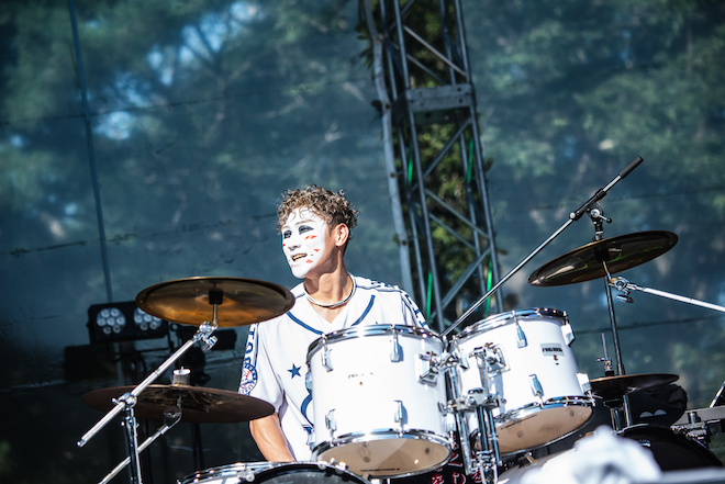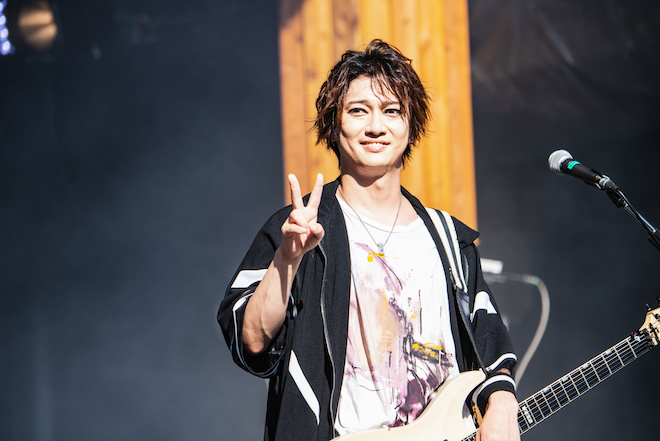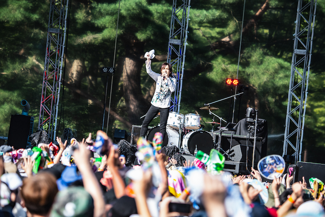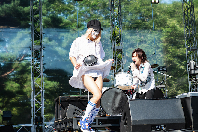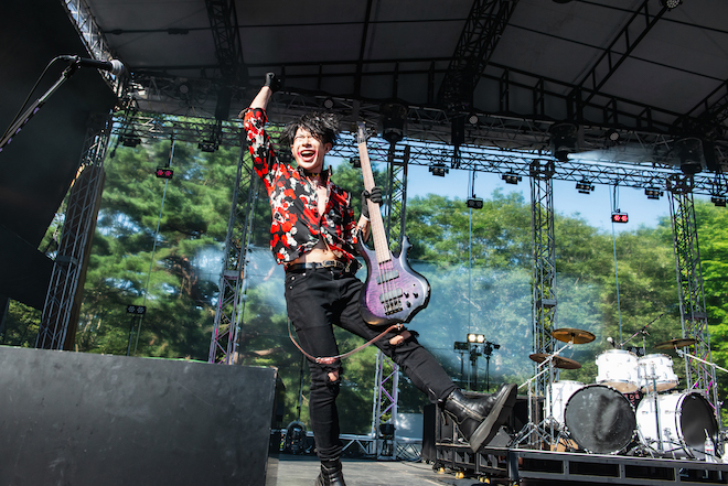 西日が眩しい、16時。観客が詰めかけたGREEN STAGEに「水分補給してますか! これからが本番ですよ。最後まで盛り上がっていきましょー!」とゴールデンボンバーが登場。まずは「Hey Yo!」をぶちかましていく。もちろん、この曲のお約束であるタオル回しも炸裂。大盛り上がりの中、鬼龍院翔(Vo)が「ちょっとだけヴィジュアル系っぽい部分があるんですけど、ヘッドバンギングとかやってくれるかな」とアナウンスすると、会場は一斉に頭を振っていった。