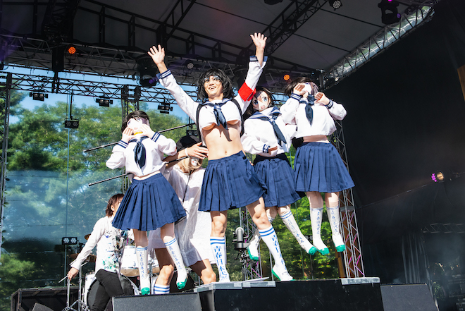 MCの後に続くのは、「また君に番号を聞けなかった」。「簡単な振り付けがあります」とステージでメンバーがお手本を見せると、会場も一体となって踊っていく。クラップも飛び出し、盛り上がっているとおもむろにステージを去る喜矢武と樽美酒。鬼龍院がギターソロのフリをすると、新しい学校のリーダーズ・SUZUKAのコスプレに3名分の人形をつけた喜矢武が登場。“はみ出していくポーズ”を決めるが、着丈が超ミニのセーラー服からは下乳がはみ出しているという、様子がおかしい姿を披露。