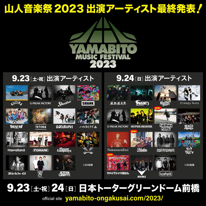 G-FREAK FACTORYが主宰するロックフェスティバル<山人音楽祭2023>が、9月23日と24日に群馬・日本トーターグリーンドーム前橋で開催される。その出演アーティストの最終発表が行われた。