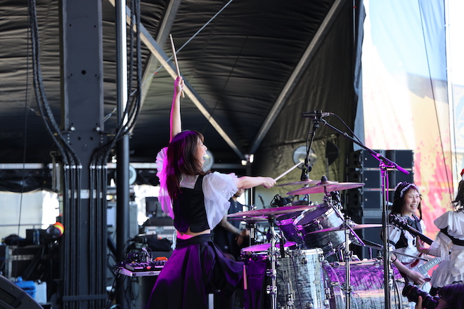 晴れ渡る青空の下、今年から一新したオリジナルSEが流れると、拳を突き上げたAKANE(Dr)に続き全員がステージに入る。名刺代わりの1曲「DOMINATION」のエネルギッシュな演奏でこの日も幕を開けた。息の合ったドラムとベースのフレーズで始まる「DICE」に続いては、海外人気も特に高い楽曲「Choose me」へ。