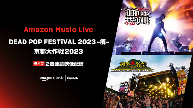 『Amazon Music Live: DEAD POP FESTiVAL 2023 -解-』は8月8日20時より、『Amazon Music Live:京都大作戦 2023』は8月15日と16日の20時より配信予定。各イベントで収録されたライブ映像に加えて、主催アーティストと出演アーティストによる生トークの模様も届ける。