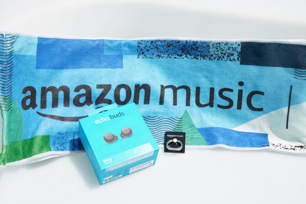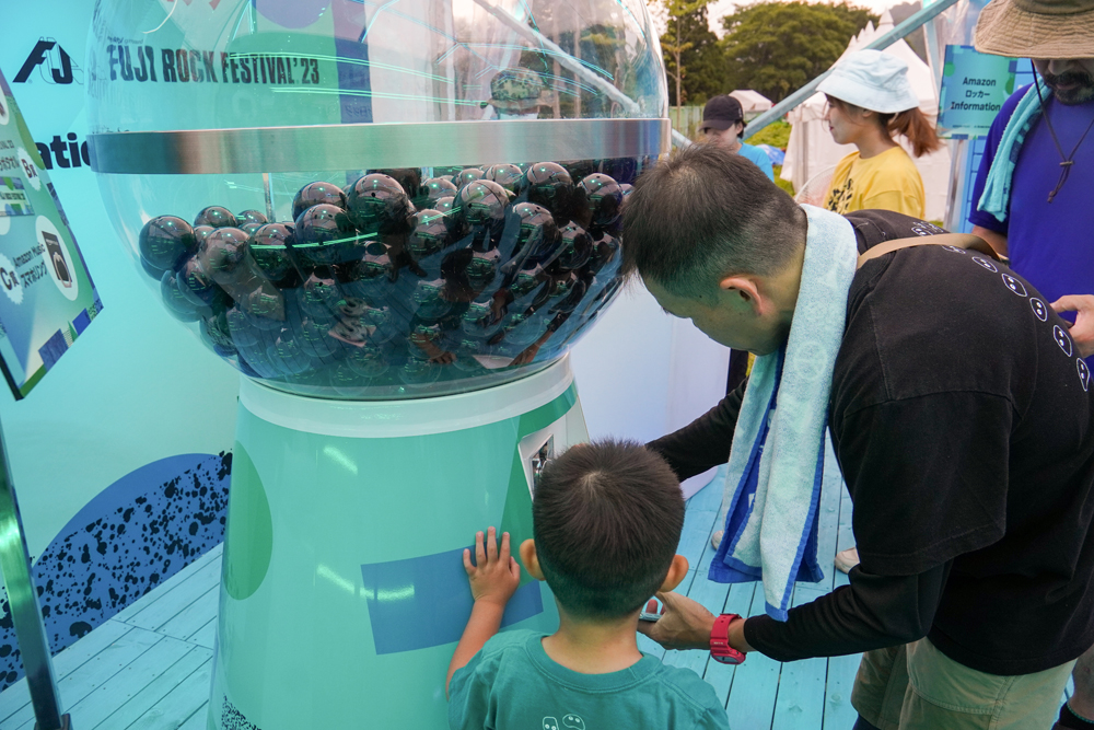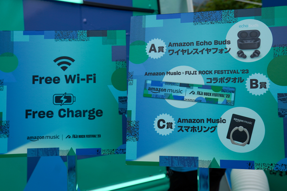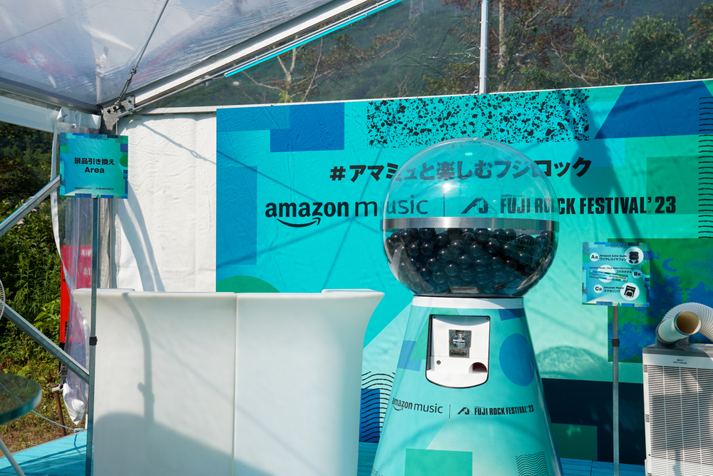 加えてブース内で目を引いたのが、やはり「FUJI ROCK 限定ガチャ」。「Playlist Cover Maker」にて作成した画像、もしくは会場ブースの写真を「#アマミュと楽しむフジロック」及び「#AmazonMusic」のハッシュタグと共SNSに投稿し、Amazon Musicアプリがダウンロードされたスマホを見せると回せるこのガチャは、ワイヤレスイヤホン「Echo Buds」、Amazon Musicオリジナルスマホリング、Amazon Musicと<FUJI ROCK FESTIVAL ’23>のコラボタオルのいずれかがプレゼントされた。