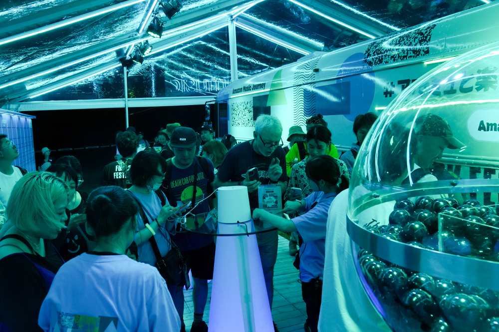 今年のフジロックといえば、入場ゲートの手前に広がる入場無料のエリア「THE PALACE OF WONDER」の復活が大きなトピックであり、深夜にライブスペースに加えてサーカスやバーなども出現するこの非日常空間のデコレーションもかなり派手で魅力的だが、日が落ちてくるとヴィヴィッドなネオン管が発光するAmazon Musicのブースもそれに引けをとらない存在感を放っていた。「Amazon Musicのブースがカッコよすぎる!」「アマゾンのブース気合い入っとるなぁ」とSNS上で投稿があったように、サイバー感のあるビジュアルからも来場者の目を楽しませてくれた。