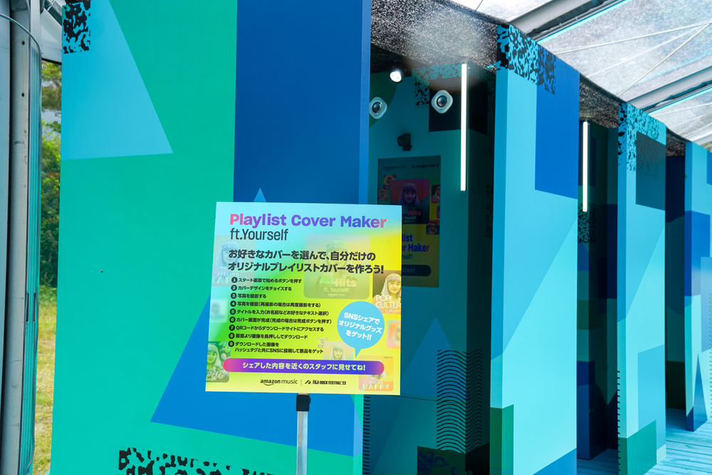 プリクラ機のような端末「Playlist Cover Maker」は、Amazon Musicで配信中の26のプレイリストのカバーアートの中からお気に入りを選択し、自分の写真を撮影して名前を入力するとオリジナルのカバーアートを作成することができる。家族で撮影して、特別な夏の思い出を作る参加者も多かったようだ。