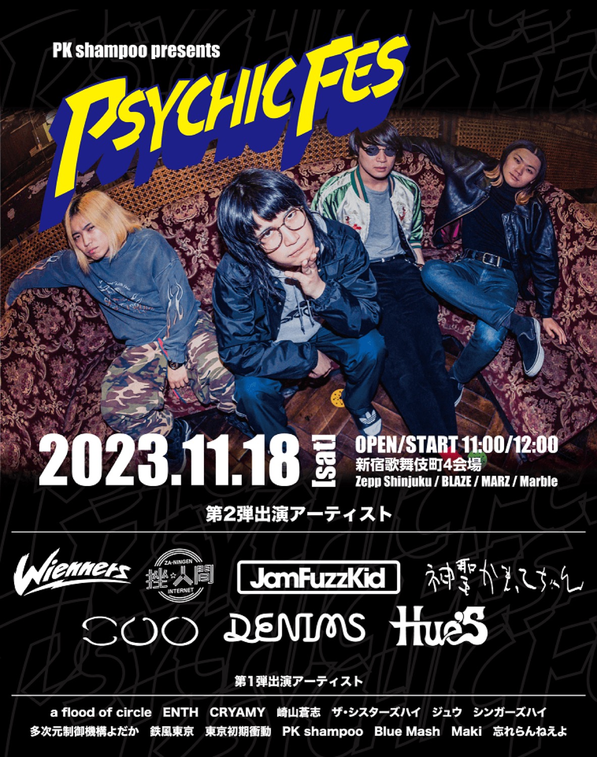 そして、11月18日(土)に東京・新宿歌舞伎町一帯のライブハウス全4カ所で初開催されるPK shampoo主催サーキットフェス<PSYCHIC FES>の第2弾出演アーティストも発表された。