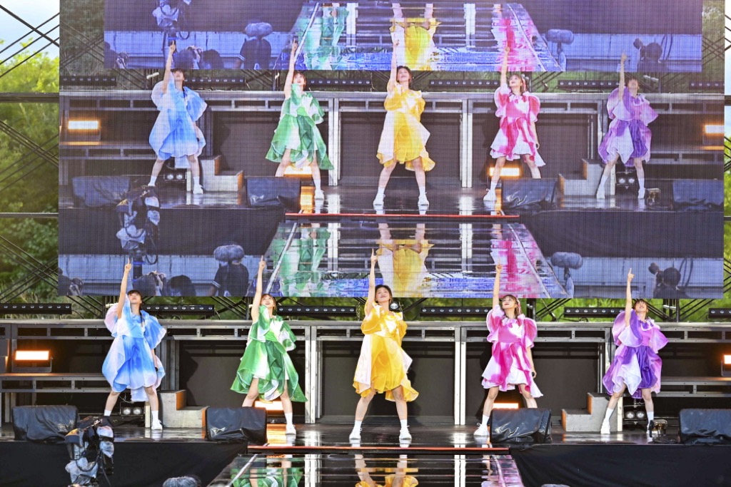 アッパーなサマーチューン「夏だぜジョニー」で幕を開けると、雨雲の隙間から太陽の光が差し込み、ファミえん定番曲「ご存知!エビ中音頭」が始まり、会場を一気にお祭りモードに突入させた。雨雲が太陽を隠すと「青春ゾンビィィズ」を披露し、MCに入り、自己紹介を挟むと4年ぶりの声出し解禁にファミリーも最大級の声援で応え、「ほぼブラジル」と立て続けに夏らしい楽曲を披露。