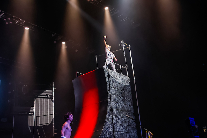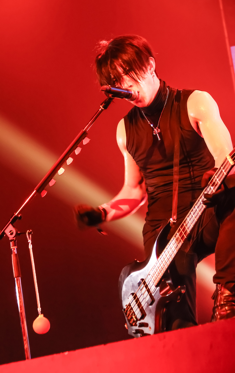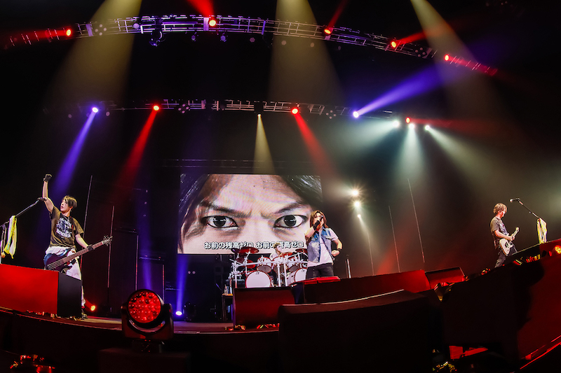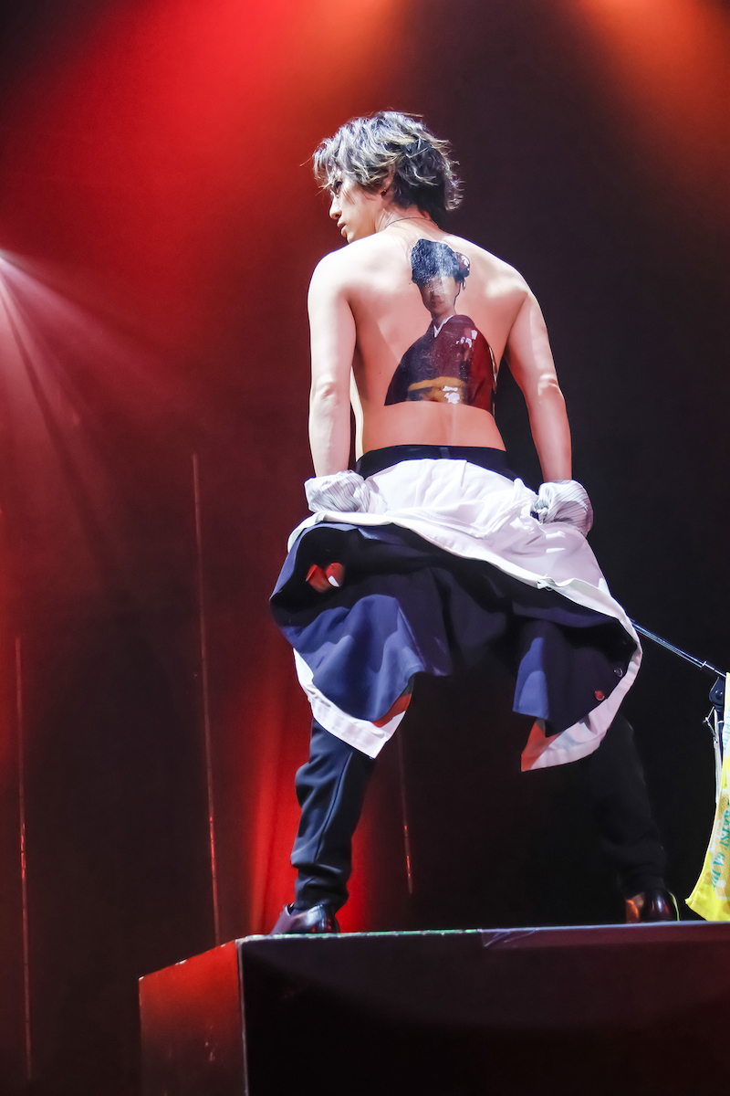 1曲目に届けたのはツアー主題歌である新曲「俺たちにはケツがある」。鬼龍院翔(Vo-karu)が「知らない曲だと思うけど!」と煽りながら、サビに入ると会場一体となって拳を突き上げた。ツアータイトル、そして拳を突き上げる様に既視感を覚えつつ、MCへ。「よく来てくれました! ツアーファイナル東京〜! ゴールデンボンバーのライブは棒立ち大歓迎です。みんなそれぞれの形で楽しんでほしい!」と鬼龍院が笑顔で伝えると、声出し解禁となった会場からは歓声と拍手が沸き起こった。