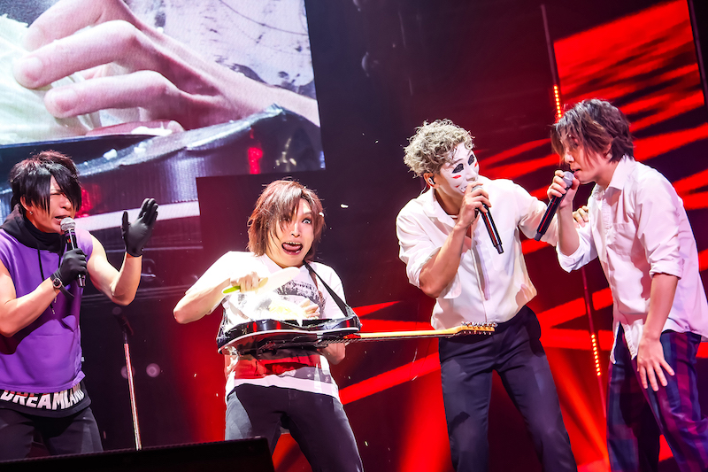 ライブパートに戻り「君といつまでも」のギターソロに突入すると、鬼龍院がギターを持つ場面も。満を持してギター演奏をするかと思いきや、突如始まるキャベツの千切り。そしてそのままキャベツを食べ始めるという荒技を見せつけた。自由奔放なパフォーマンスから息つく間も無く、歌広場淳(Be-su)が「まわせまわせ〜!!」と煽り「Hey Yo!」に突入。タオルを振り回しながら勢いよくメンバーのラップが繰り出され、会場の熱気が高まっていく。まだまだといわんばかりに『人間だ』、『暴れ曲』を披露、激しいサウンドとヘドバンの嵐で熱狂はさらに加速し「†ザ・V系っぽい曲†」で本編を締めくくった。
