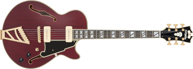 ピックアップはスタック・タイプのセイモア・ダンカンSTK P-90(クリーム・カラー)を2基搭載。コントロールは1ヴォリューム、1トーン、3ウェイ・ピックアップ・セレクターのレイアウト。ハードウェアはゴールドで統一し、チューニングの安定を実現したグローバーのスーパー・ロトマティック・ロッキング・マシンヘッド、チューンOマティック&ステア・ステップ・テイルピースの仕様。カラーは、サテン・トランス・ワインとなっている。