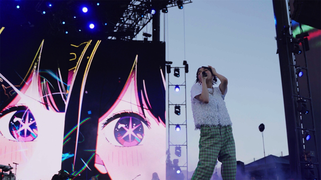夕刻になってもなお真夏の日差しが照りつけるRose Bowl。YOASOBIのパフォーマンスを心待ちにする観客の熱気もじりじりと高まる中、それを煽るような入場SEとともにボーカルのikura、コンポーザーのAyase、4人のバンドメンバーが姿を現す。“We are YOASOBI!”というikuraの宣言に応える大きな歓声に現地の期待感があらわれていた。