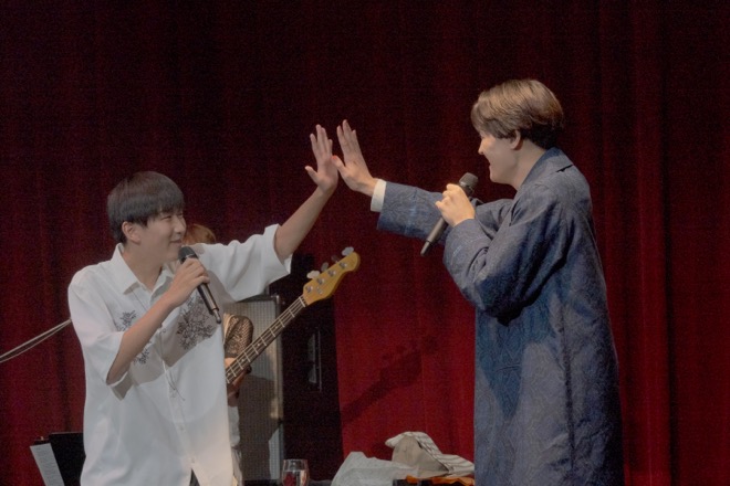配信リリースする新曲は、久しぶりのオリジナル新曲かつ海蔵自身も作詞に参加した「未来のトビラ」と、この日のライブにもゲストとして登場しコラボした、久保陽貴とのデュエット曲「ハレルヤ」だ。「ハレルヤ」は、久保陽貴+海蔵亮太という名義で配信リリースする。両曲はワンマンライブでも披露した。