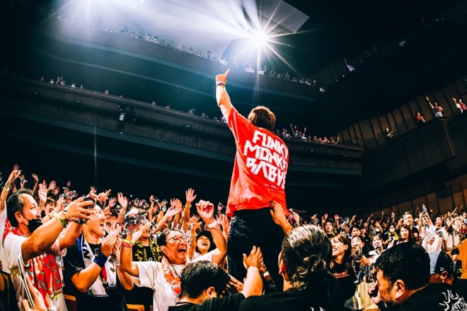 「こうやってみんなと一緒に歌を歌うことができて、心から嬉しく思ってます。3年間、我慢することが多かったけど、俺たちが歌ってるこの空間だけは我慢することない。みんなが歌いたい時に歌っていい。それがFUNKY MONKEY BΛBY’Sのライブだからね。みんなが我慢してくれたから、またあの日みたいな光景を取り戻すことができました。みんなと一緒に大合唱したい歌があるんで、力を貸してください。あなたの声が聴きたいんだ!」とライブの途中で観客に呼びかけていたファンキー加藤。そしてスタートした「あとひとつ」で客席から沸き起こった歌声は、特大級だった。