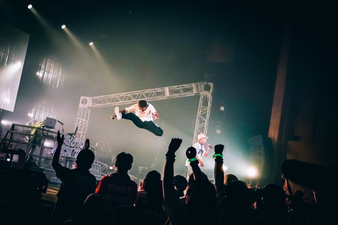 今回のライブに関して、もう1つ紹介しておきたいのは、序盤からものすごい気迫が伝わってきたという点だ。サポートメンバーのDJ・バカムスコ翔が放った大音量を合図にステージに2人が勢いよく飛び込んできて1曲目がスタート。ファンキー加藤が最初からアクセル全開なのはいつものことだが、モン吉も同様なのは前例がないように感じた。新鮮な印象のオープニングとなった理由は、その後のMCで明らかとなる……。