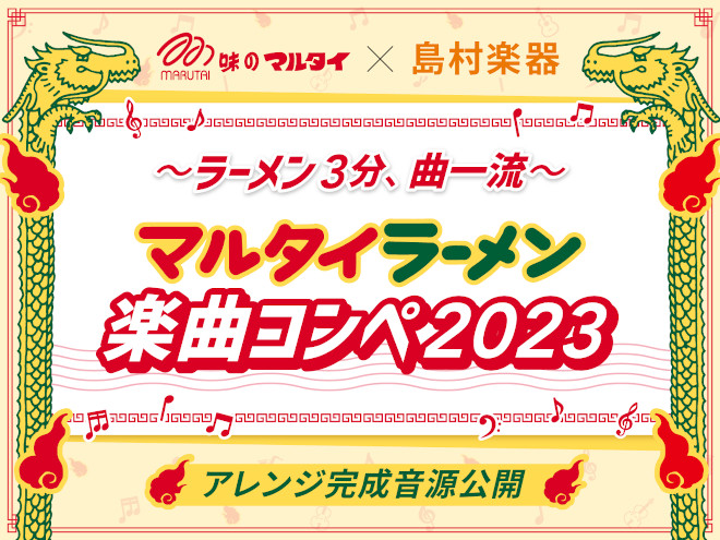 島村楽器が、「棒ラーメン」でおなじみのマルタイとコラボレーションし、作品募集を行った楽曲コンペティション<~ラーメン3分、曲一流~ マルタイラーメン楽曲コンペ2023>を開催。最優秀賞に選出された楽曲「幸福のラーメン~マルタイラーメン~」(作曲:小島 美和)のプロによるアレンジ完成音源を8月11日正午より特設サイトにて公開する。全国の島村楽器店内BGMでも期間限定で聴くことができる(一部店舗を除く)。