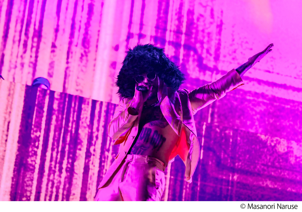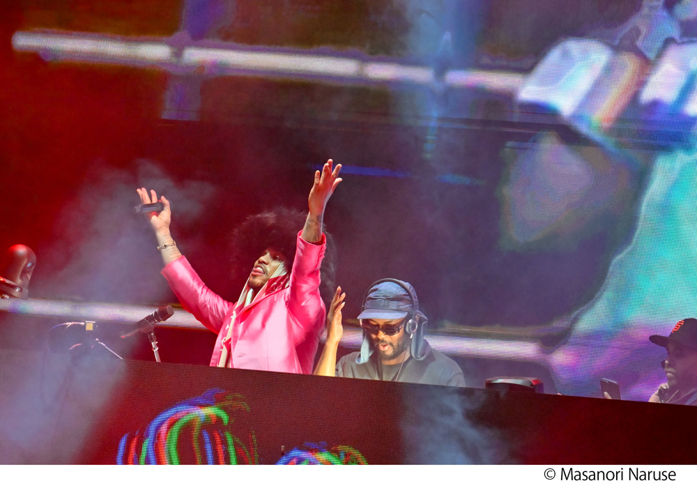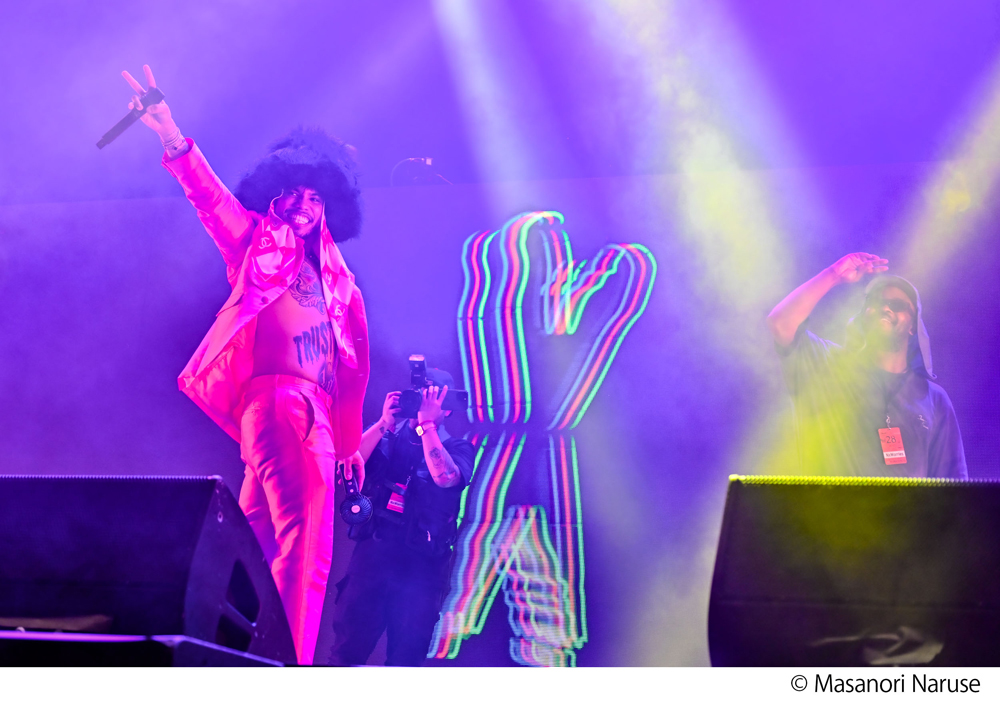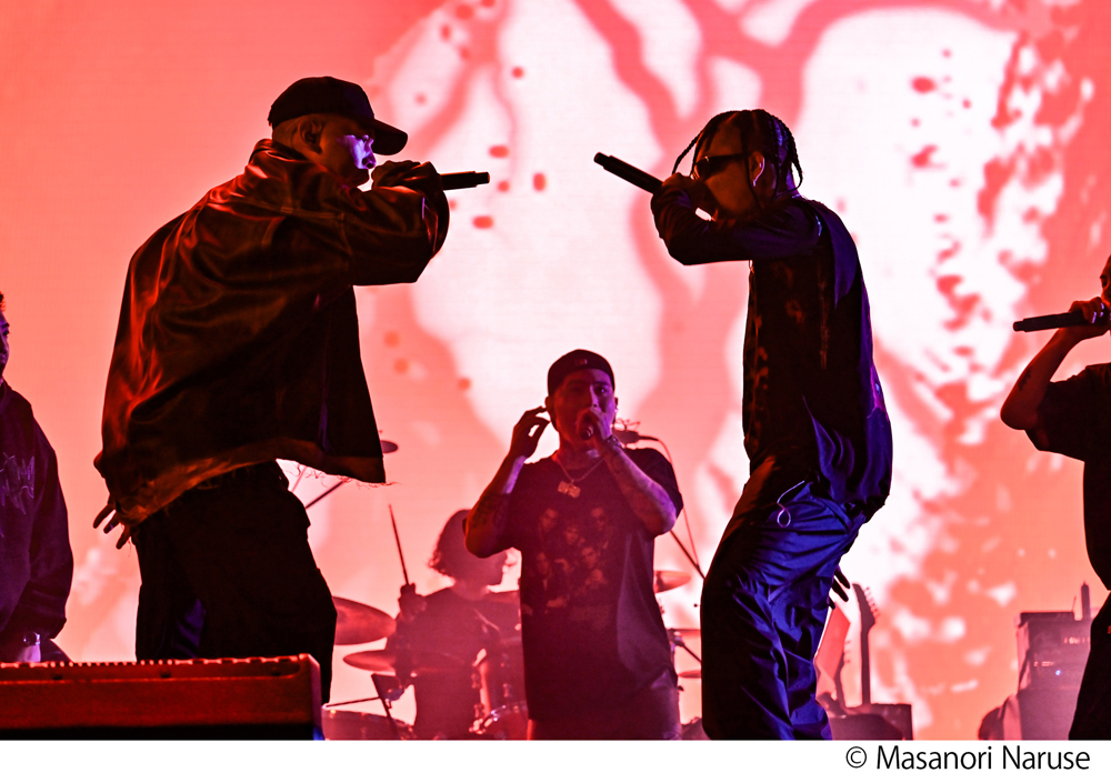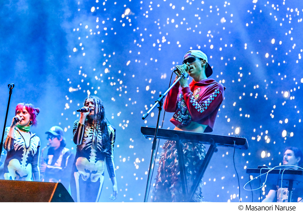 また、ここ数年にわたりジャパニーズ・ヒップホップシーンを牽引しながら、先日解散を発表したBAD HOPの最初で最後のフジロックでのパフォーマンスも堂々GREEN STAGEで披露された。ルイス・キャパルティが出演キャンセルした枠へ、SMASHの満場一致でオファーが決定したという。初のバンドセットという気合いの入れようでRIZEの金子ノブアキ(Dr)、KenKen(Bs)、the HIATUSのmasasucks(Gtr)、さらに伊澤一葉(Keys)による破壊力のあるロックサウンドと融合し、フジロックというステージにしっかりアジャストさせ、オーディエンスに対して丁寧に自己紹介する礼儀も含めて、インディペンデントでここまで磁場を広げてきた彼らの功績が改めて納得できたし、個々の活躍にも期待が高まった。1曲目は名詞のような「Kawasaki Drift」。日本のエンタメ界における数少ない若きカリスマ、T-PablowのあのバースにGREEN STAGEの緊張感が一気に増した瞬間はさすがだった(その後のMCで、娘たちに呼びかけていたPablowの姿はきっと誰もがジンときてた)。