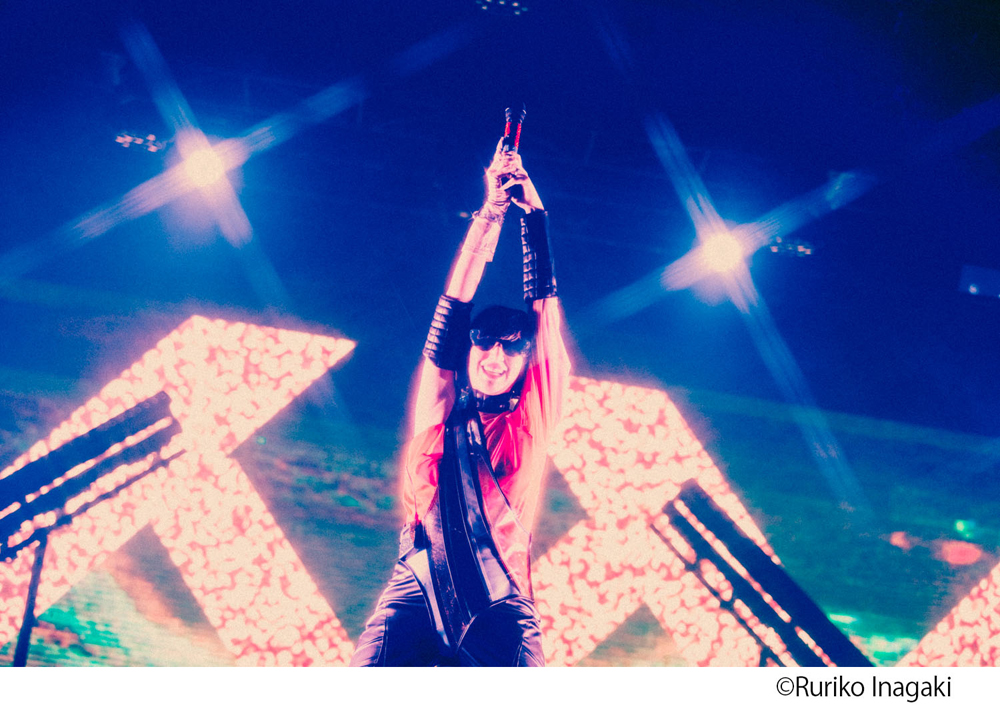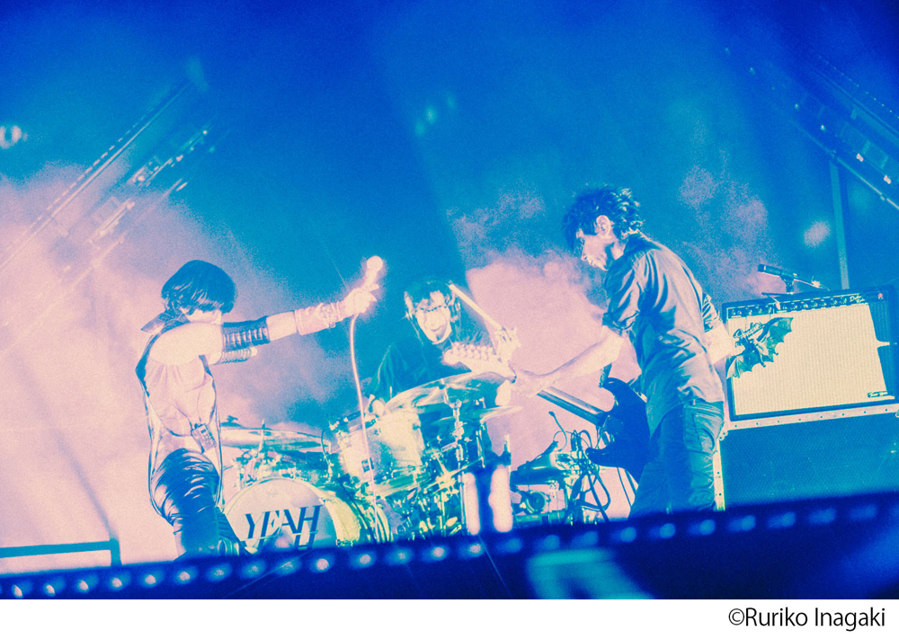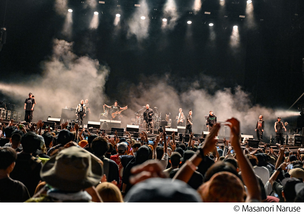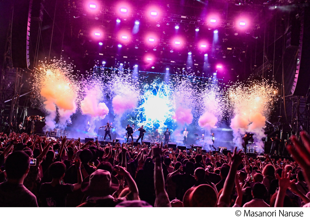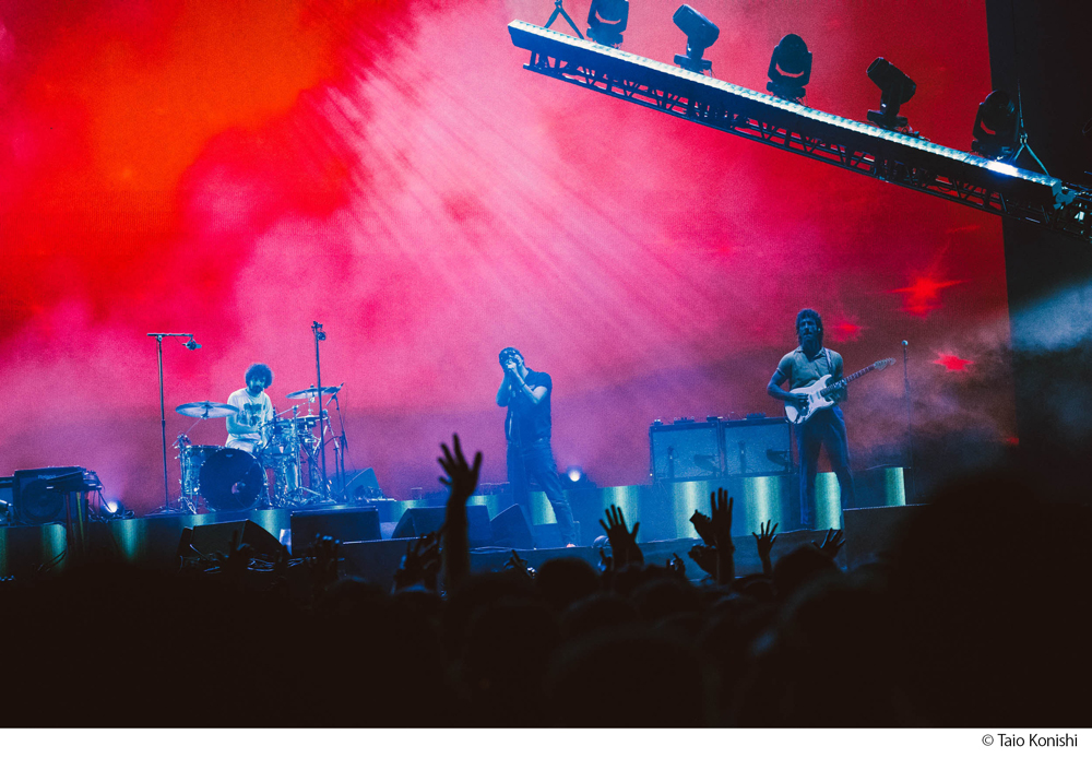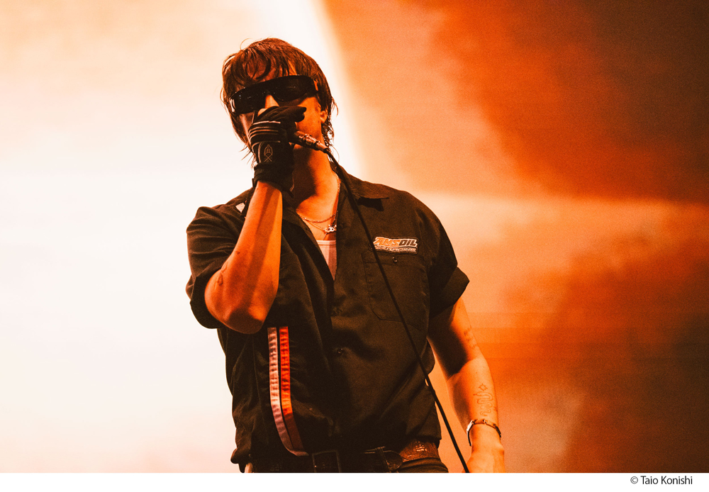 また、ここ数年にわたりジャパニーズ・ヒップホップシーンを牽引しながら、先日解散を発表したBAD HOPの最初で最後のフジロックでのパフォーマンスも堂々GREEN STAGEで披露された。ルイス・キャパルティが出演キャンセルした枠へ、SMASHの満場一致でオファーが決定したという。初のバンドセットという気合いの入れようでRIZEの金子ノブアキ(Dr)、KenKen(Bs)、the HIATUSのmasasucks(Gtr)、さらに伊澤一葉(Keys)による破壊力のあるロックサウンドと融合し、フジロックというステージにしっかりアジャストさせ、オーディエンスに対して丁寧に自己紹介する礼儀も含めて、インディペンデントでここまで磁場を広げてきた彼らの功績が改めて納得できたし、個々の活躍にも期待が高まった。1曲目は名詞のような「Kawasaki Drift」。日本のエンタメ界における数少ない若きカリスマ、T-PablowのあのバースにGREEN STAGEの緊張感が一気に増した瞬間はさすがだった(その後のMCで、娘たちに呼びかけていたPablowの姿はきっと誰もがジンときてた)。