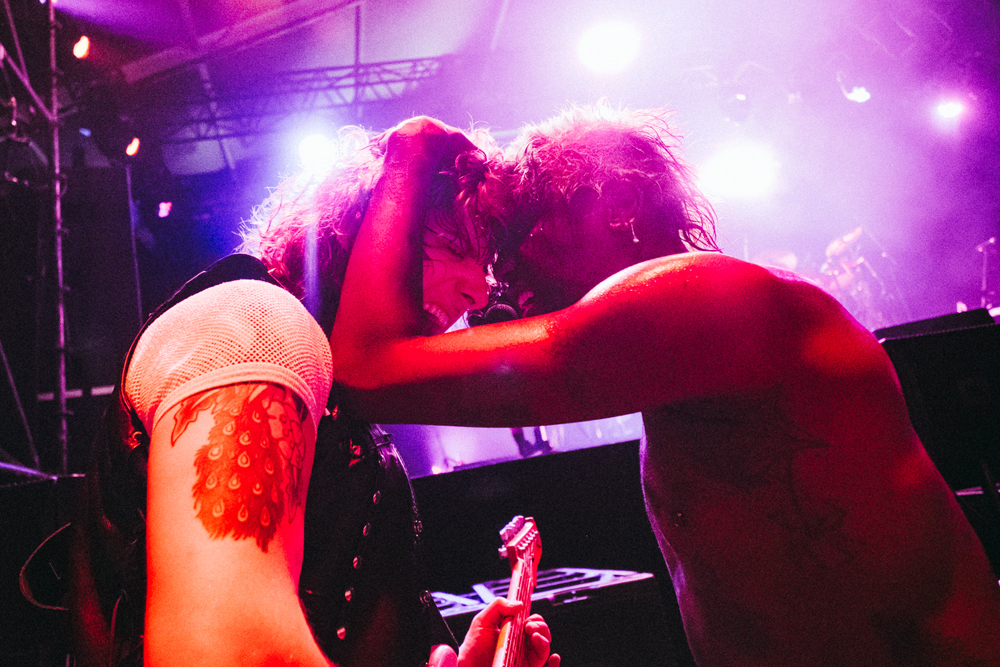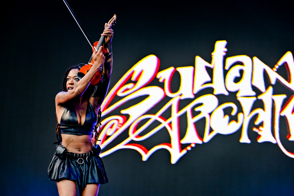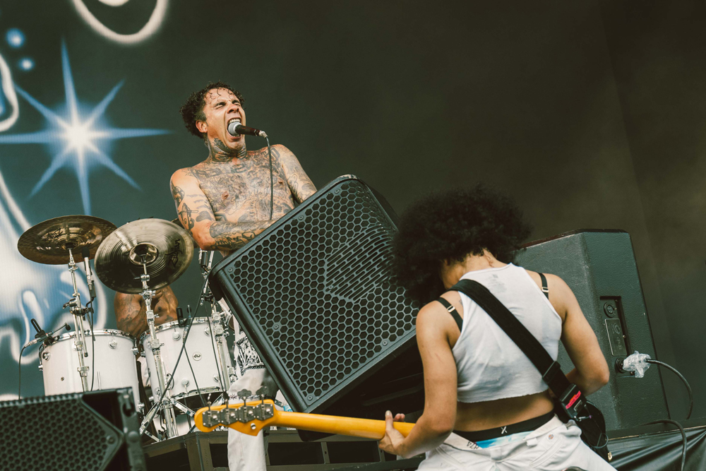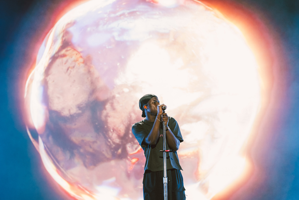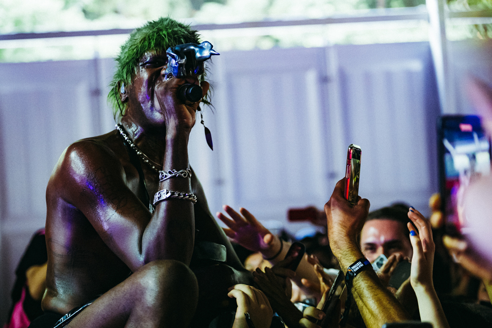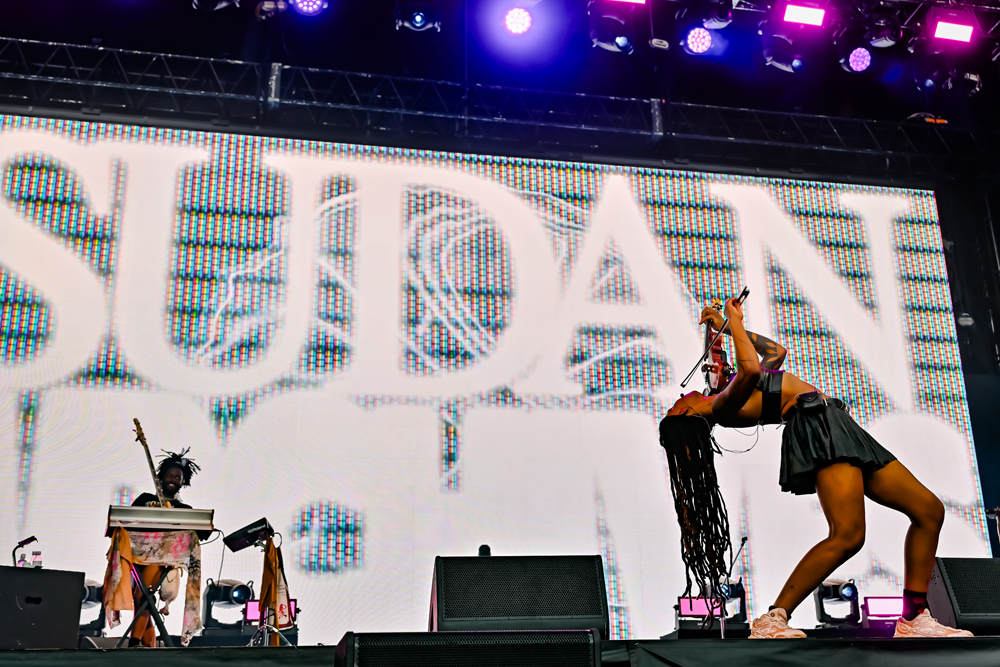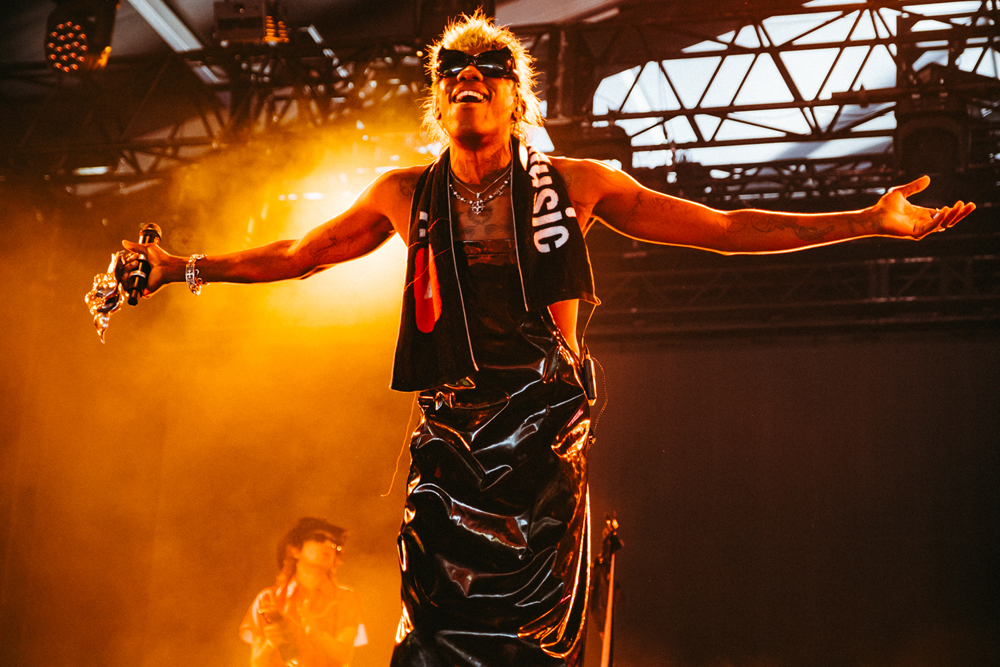 フジロックの生みの親であるSMASH日高正博氏の「日本におけるバケーションの取り方を変えたい」という願いが投影されたかのように、平日の金曜日からの来場を誘発するように初日は観たいアクトが多かったように思う。昨年の<朝霧JAM>で虜になった君島大空はFIELD OF HEAVENに西田修大(G)、新井和輝(B)、石若駿(Dr)とともに合奏形態で出演。太陽が照りつける中で繊細かつ大胆に音を重ね続け、君島の危うく鋭い歌声も相まって脳がグラつく思いがして満たされた。『マッドマックス 怒りのデス・ロード』をも思わせる仮面をつけて代名詞のバイオリンと共にWHITE ATAGEに登場したスーダン・アーカイブスは、R&B〜アフリカ〜エレクトロニックを横断するアーティスト。音源よりも、バイオリンの鳴りがパーカッシブだったり肉感的で未知のステージだった。同じくオルタナティブなアーティストといえば、イブ・トゥモア。サイケデリックな音像は美しく怪しく、RED MARQUEEは時に天国のように、時に地獄と化し、イブ・トゥモアの一挙手一投足に観客が沸く光景はいかにもグラム・ロックらしい。1枚ずつ衣装を脱いで解き放されてゆき、最後はパンツ姿というパフォーマンスもドラマティックだった。
