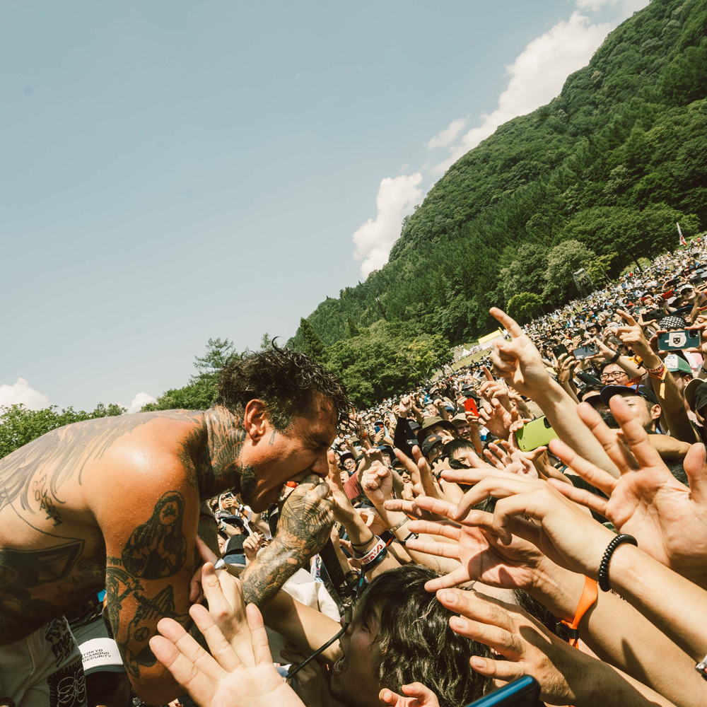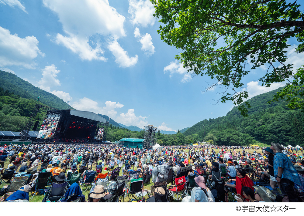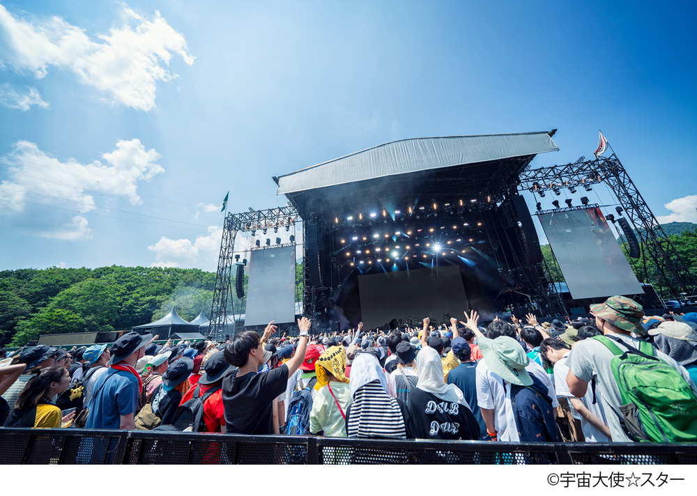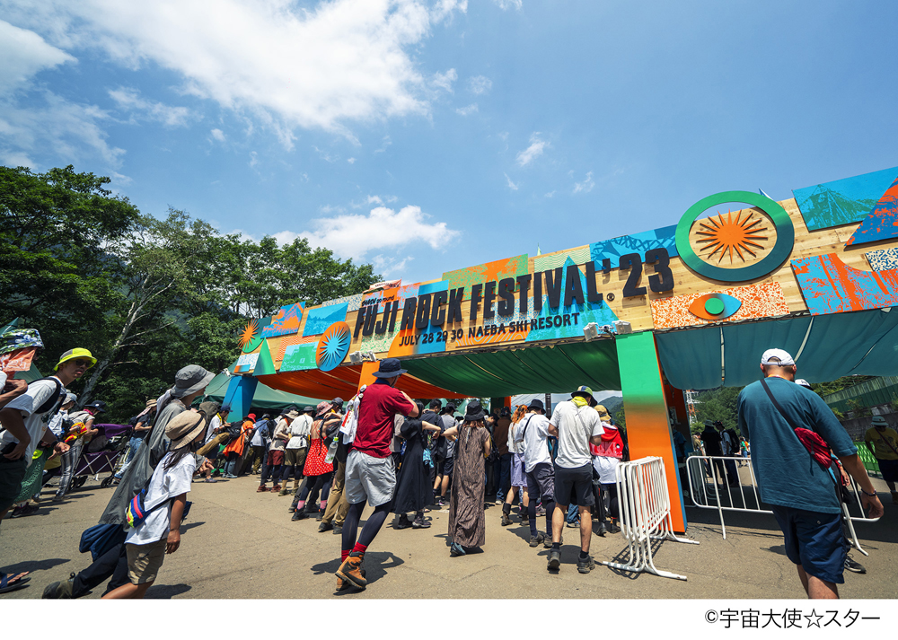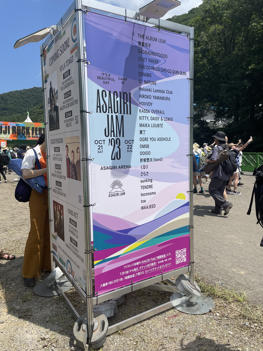 入場ゲートに向かうと、ゲート直前に設置された立て看板で、フジロックの兄弟フェスである<朝霧JAM>(今年は10月21〜22日に開催)の出演アーティスト第一弾が発表されていた。フジロックが牽引し、コロナ禍前までは日本の津々浦々で開催されてきた音楽フェスも、この2、3年は開催されるか否かが時々の状況次第だったが、堂々設置される看板から、翻弄される季節が過ぎたことも目の当たりにする。入場ゲートでも、もう何かに妨げられることもなく、満面の笑顔をスマホで収める人々で溢れかえっていた。ちなみに、7月11日にBS-TBSで放送された番組『X年後の関係者たち~あのムーブメントの舞台裏~』でフジロックが特集され、さらに会場にはNHK『ドキュメント72時間』やNHK『100カメ』の取材が入っていたようで、今年のフジロックの注目度とフジロックの浸透度合いを再確認した。