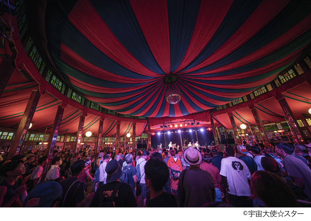 このOASISをはじめ、ゲート前のYELLOW CLIFF、川の間近でチル感満載のところ天国、最果てに位置するが屋根付きフードコートもあり快適なORANGE CAFÉなどのフードエリアも大盛況で、苗場食堂のとろろめし、下町バルながおか屋のラムチョップ、森のハイジカレーの鉄板メニューはもはやフジロック名物と化していて、個人的には“nacre”の仙台牛ガーリックライスが、朴葉の上にライスが乗ったビジュアル面からも食欲をそそった。キネマおじさんのやばい一人芝居や、こどもたちが口をポカンとあけて見つめ続けてしまうボールド山田のスタチュー、お客さんも巻き込みながらフレディ・マーキュリーネタで楽しませるフレディーノなど、噺家や大道芸人も帰ってきたフジロックを盛り上げたメンバー。